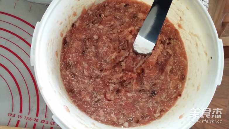 3、把香菇水一点一点的加到调好味的肉馅中,每加一点水都要顺时针搅拌至水吸进肉馅中,再加下一次。把香菇水130克全部打入肉馅儿中,放冰箱冷藏一下,2-3小时取出肉馅。