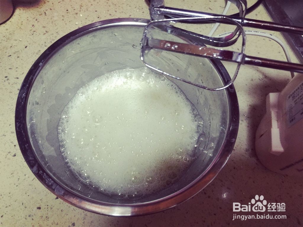 5、把蛋白用电动打蛋器稍打成大泡状,然后分3次加入白糖;