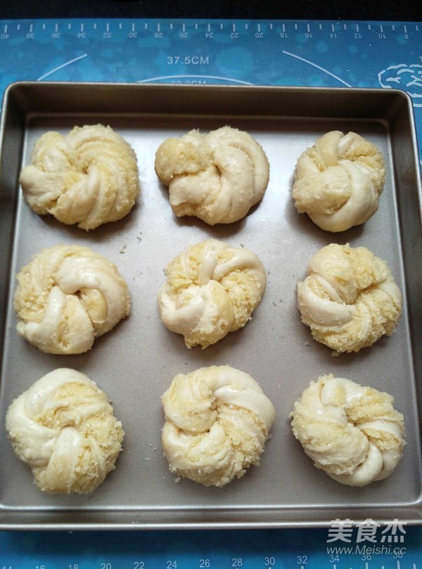 7、拿起割好的面团扭几下打个结。接口朝下放入烤盘。