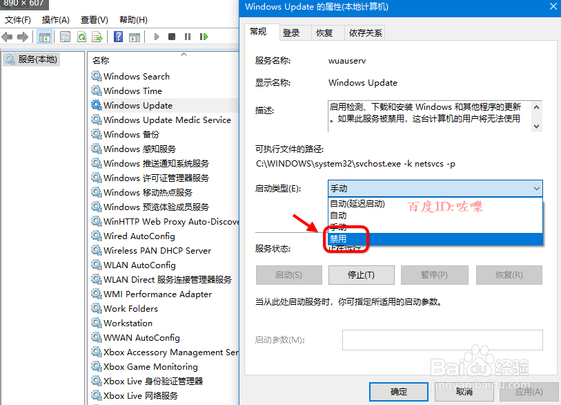 3、禁用win10更新如果要禁用自动更新服务,右击服务下拉选择类型为“禁用”