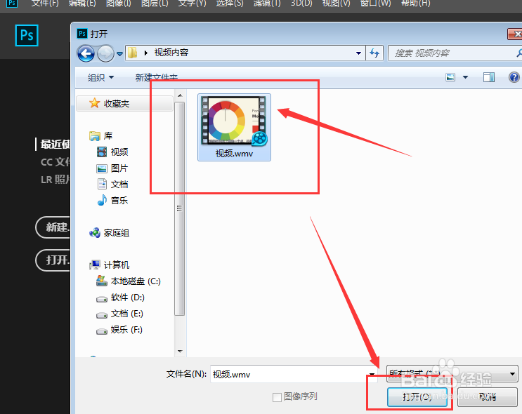 1、准备好自己的视频,最好时间很短的那种,不然渲染时间会很长。在PS中的文件中导入选项栏,找到视频帧到图层选项设置,点击打开
