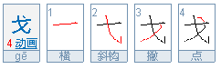 “戈”字的笔顺:横、哿诡肿牟斜钩、撇、点