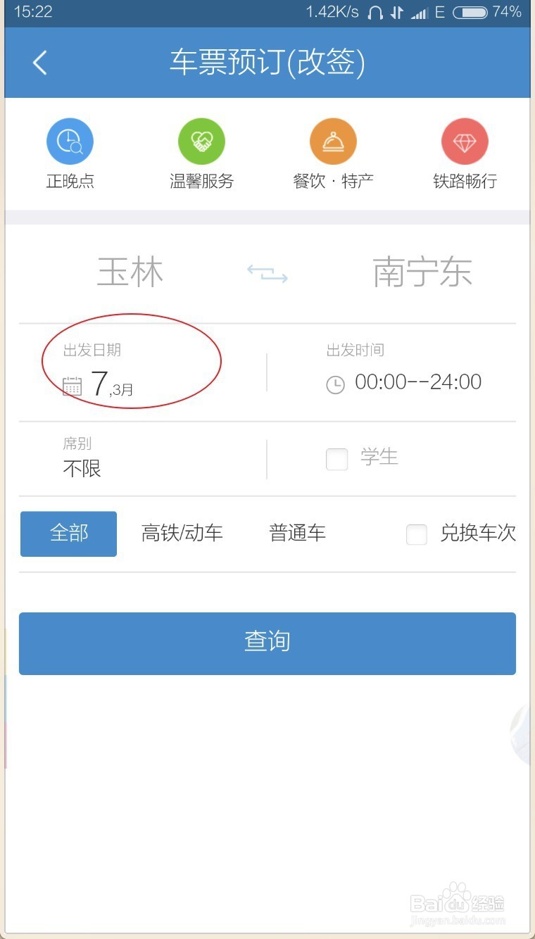 5、在已预订旁边有个小勾点击这个勾,然后点击改签,点击日期这里选择一个日期即可。需要注意的是,必须在列车未出发前进行改签,并且最迟不得超过列车出发前的三十分钟。否则车票就是作废了。