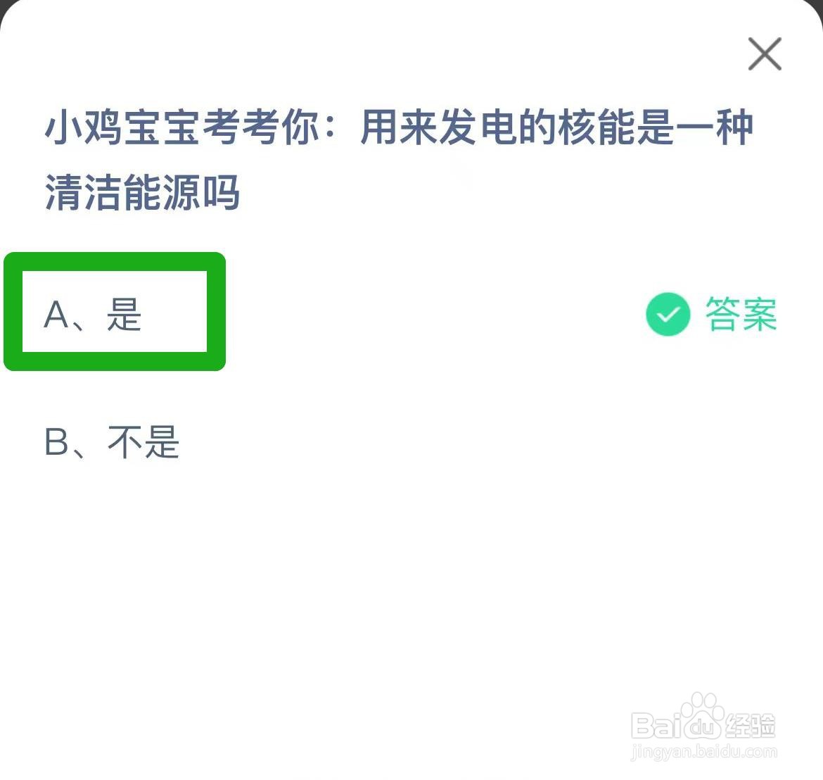 1、小鸡宝宝考考你: 用来发电的核能是一种清洁能源吗:答案:A、是