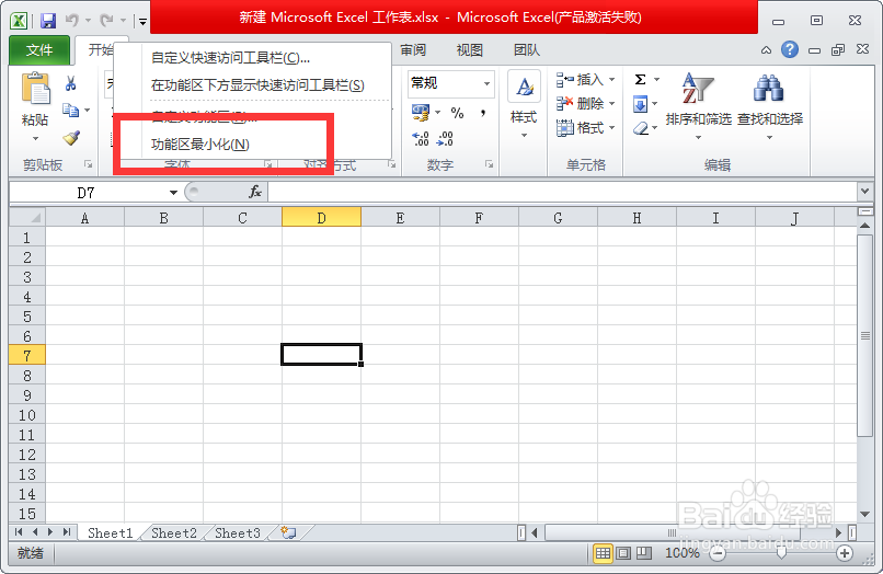 1、如果Excel的功能区被隐藏,鼠标左键单击Excel菜单栏中的【开始】标签,即可显示功能区;