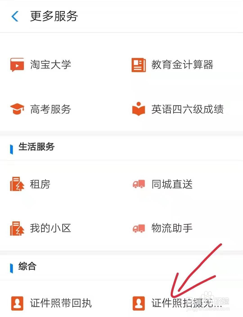 2、然后,在办事大厅里面选择更多服务,下拉,在综合栏里面点击证件照拍摄。如图所示