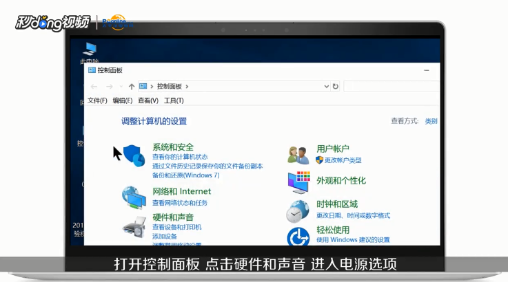 1、打开控制面板,点击硬件与声音,进入电源选项。