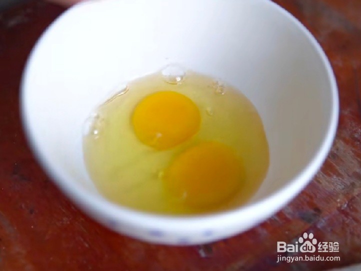 2、先把两个鸡蛋打入碗中,加上细砂糖,用打蛋器搅拌均匀。