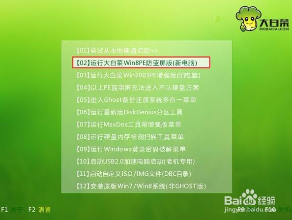 2、使用启动快捷键引导U盘进入大白菜主菜单界面,选择“【02】运行大白菜Win8PE防蓝屏版(新电脑)”回车确认。