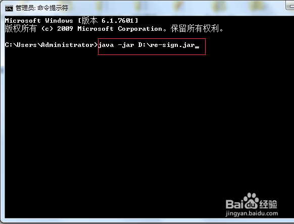 3、打开cmd命令行,在命令输入java -jar 路径/re-siger.jar