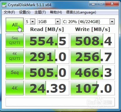 11、CrystalDiskMark测试最大读取速度554.5MB/S,写入最大508.4MB/S ,4K随机读取是24.39MB/S,写入是107.0MB/S,WIN7测试结果总体比WIN10好,CrystalDiskMark测试WIN7胜。