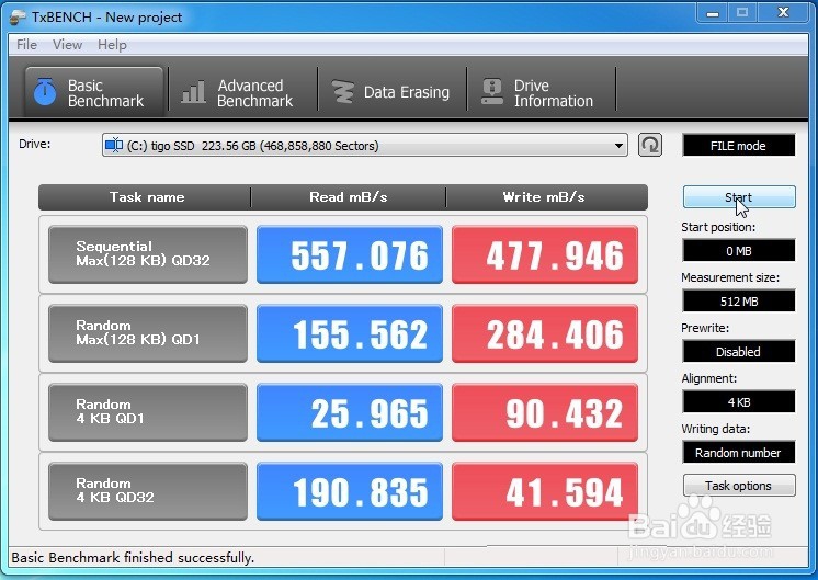 4、TxBENCH也是一款专业的固态硬盘测试软件,跑了4遍,就选第一次的测试结果吧,读取最大547.356MB/S,写入最大509.926MB/S, 4K随机读取是26.305MB/S,写入是97.168MB/S。