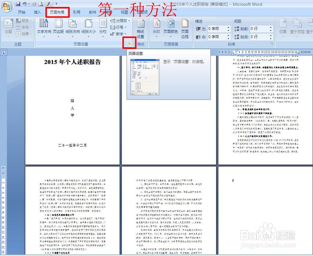 5、然后调出“页面设置”窗口,有三种方法:第一种方法,点击工具栏“页面布局”——扩展按钮弹出;第二种方法,点击工具栏“页面而已”——“纸张大小”下拉菜单,点击“其它页面大小”弹出;第三种方法为双击标尺弹出。