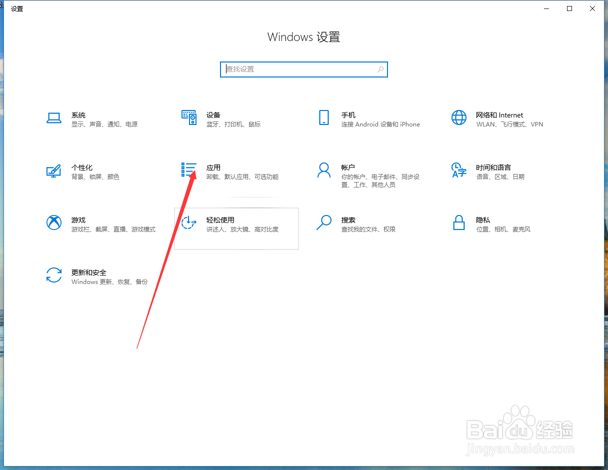 1、打开电脑的设置选项,点击进入应板驾用管理设置