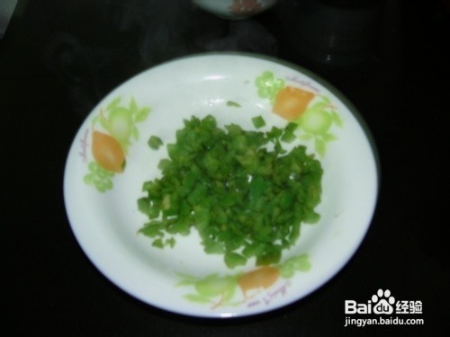 3、将青椒去掉尾部,并切成末,放入盘中备用