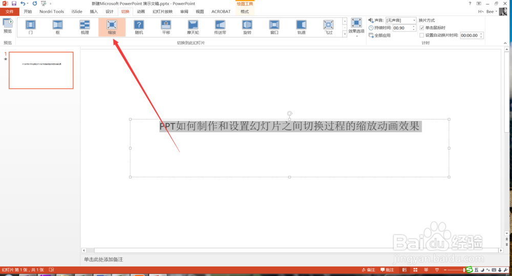 2、首先选中设置动画效果的幻灯片,然后点击切换菜单下的缩放动画效果,如下图所示。