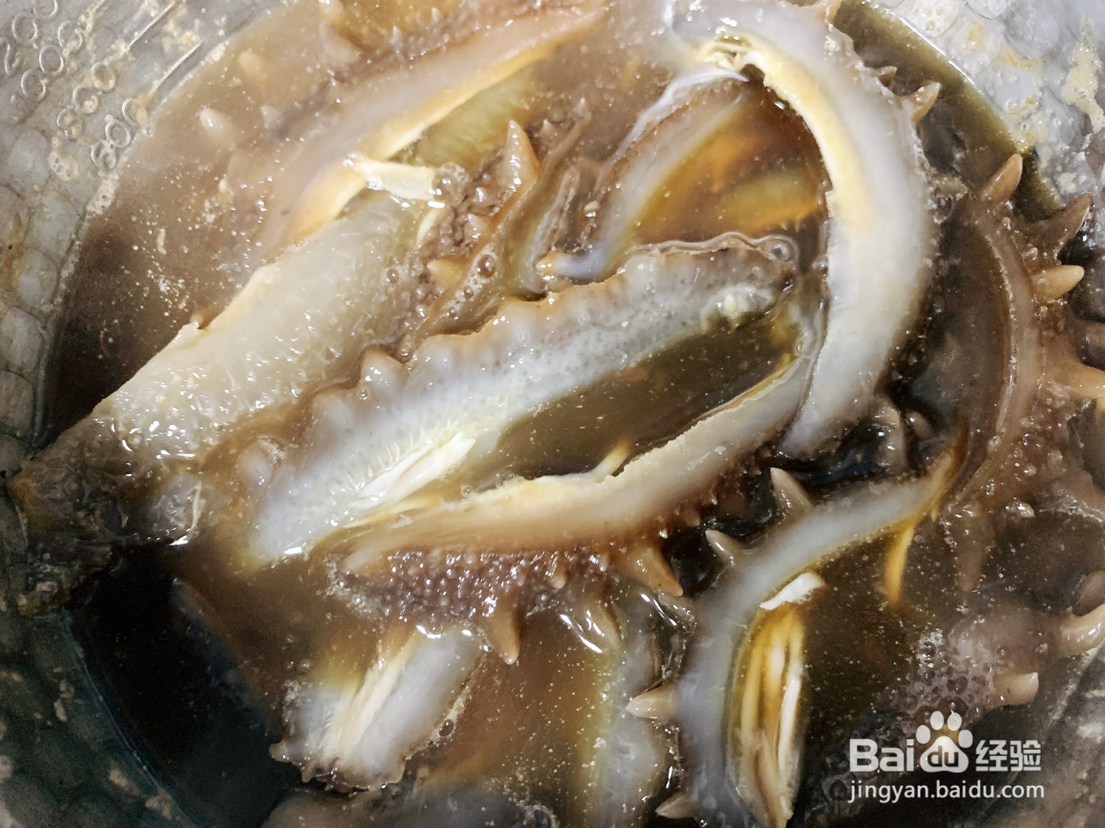 4、海参放入鲍汁中煨制,大火烧开,转小火,煨制15分钟,之后关火,静置15分钟。