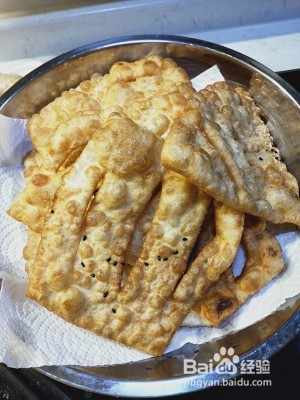 3、试下油温,稍稍有点灼手就可以放下面片,稍炸一下就翻面,不要糊了