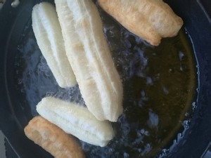 3、锅里倒油,中大火开始烧,把面切成1.5厘米-2厘米左右宽的长条,然后两条摞在一起,中间用筷子按一下。
