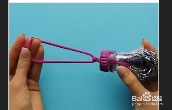 3、用一根线依次穿过钢丝球,可乐瓶,和瓶盖,再将瓶盖与瓶口拧紧。