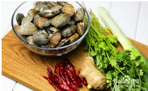 7、接着,将葱姜蒜放入锅中煸炒出香味,再将花蛤放入锅中煸炒匀均。