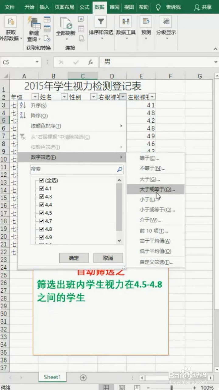 5、用相同的方法来筛选左眼的视力,然后点击确定。