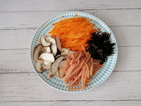 主料:鸡蛋1个、香菇2朵、火腿肠1根、胡萝卜20克、木耳3朵。