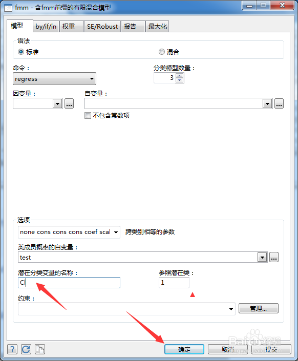 4、在潜在分类变量的名称中输入cl选项之后,点击确定