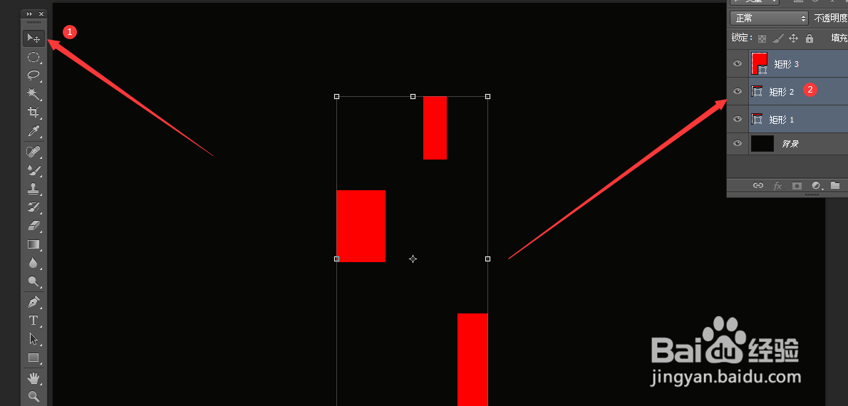 1、打开PS软件,新建文档,点击形状工具里面的矩形工具,绘制三个出来,效果如下