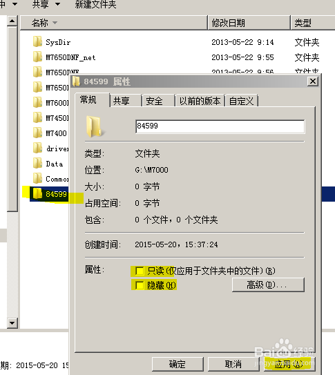 7、检查完后,再到这个目录下,右键点击有问题的目录属性,把隐藏和只读属性去掉,全部应用,然后再打开目录就能看到目录中可能是有文件或文件夹的,如果没有可以直接删除了。