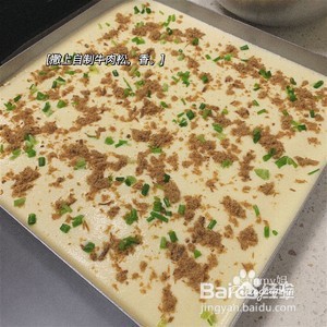 12、烤盘抹油,底部四周都抹,用厨房纸擦一遍比较方便或者垫油布~倒入面煳,撒上肉松和葱花。肉松是自己做的,搜牛肉松就可以找到