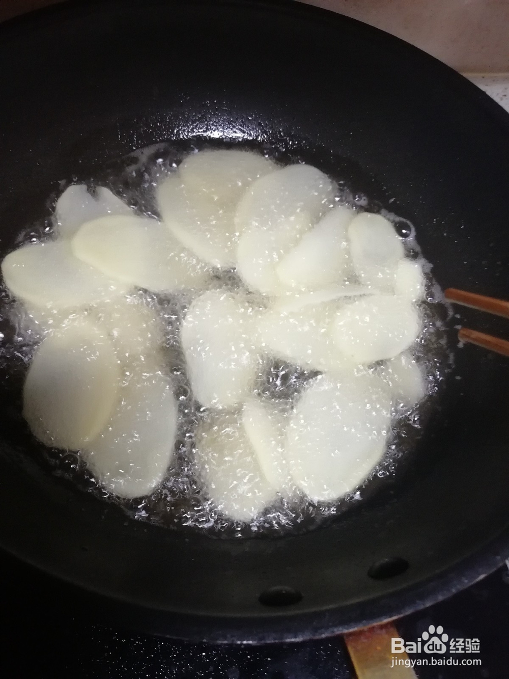 5、热锅烧油,等到油五成热的时候开始下土豆片,可以多次翻面,这时候土豆片上方会出一层气泡,多次翻炸,直到气泡消失。