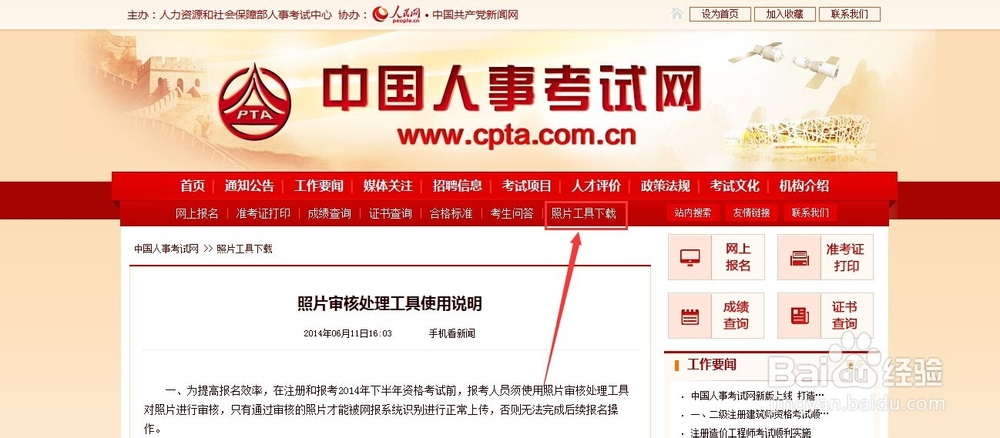 1、 打开中国人事考试网官网,点解主页面上的【照片工具下载】,下载照片审核工具,如图所示