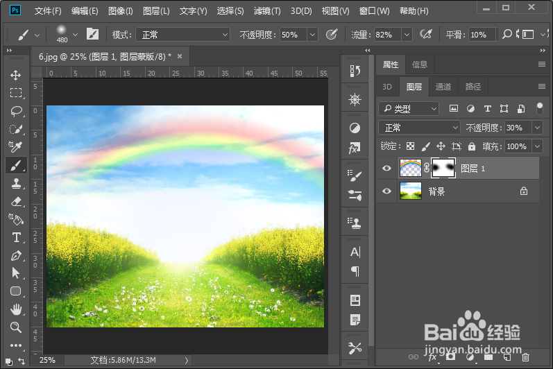 8、在蒙板中将彩虹两边适当的淡化处理,效果完成。