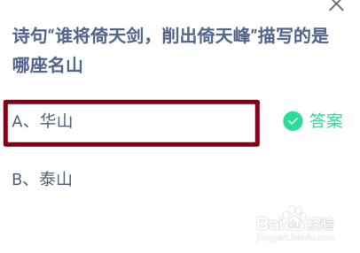 1、蚂蚁庄园问题晃茄:诗句“谁将倚天剑,削出倚天峰夏霜涛”描写的是哪座名山?