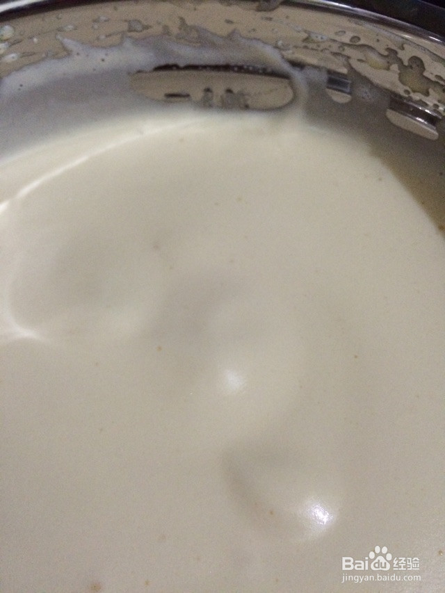 3、至蛋糊表面有光泽,打蛋机头蛋糊不容易滑落,牙签插入之后不倒,蛋糊就基本完成了。最后用两分钟低俗整理蛋糊的气泡,使最后的海绵蛋糕整体比较细腻。