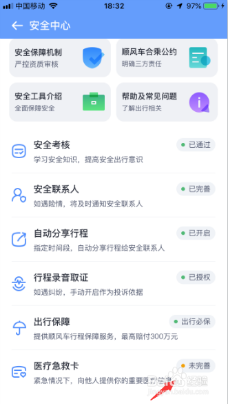 4、在安全中心的下方列表中点选“医疗急救卡”选项,该选项默认情况下是处于“未完善”状态。