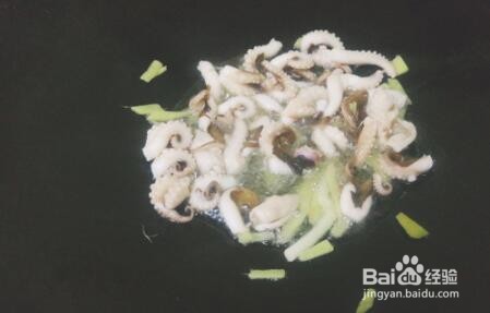 5、.只要翻炒均匀,10下左右就可以铲出来备用囊况。接着把洋葱和辣椒放下去翻炒,炒至洋葱变软后把炒好的八爪鱼再倒下去翻炒均匀。