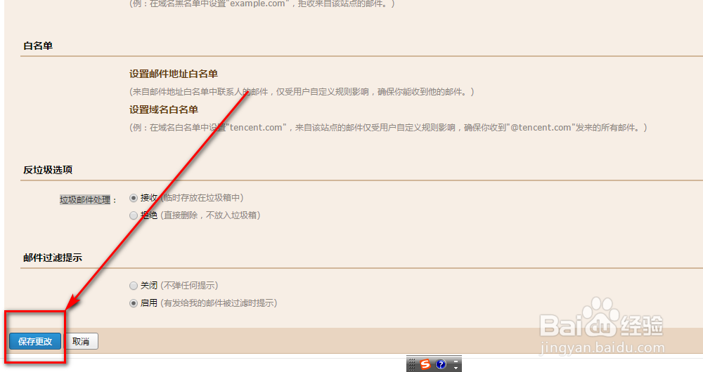 6、在【反垃圾选项】中,选择垃圾邮件处理位接受;【邮件过滤提示】为【启用】;