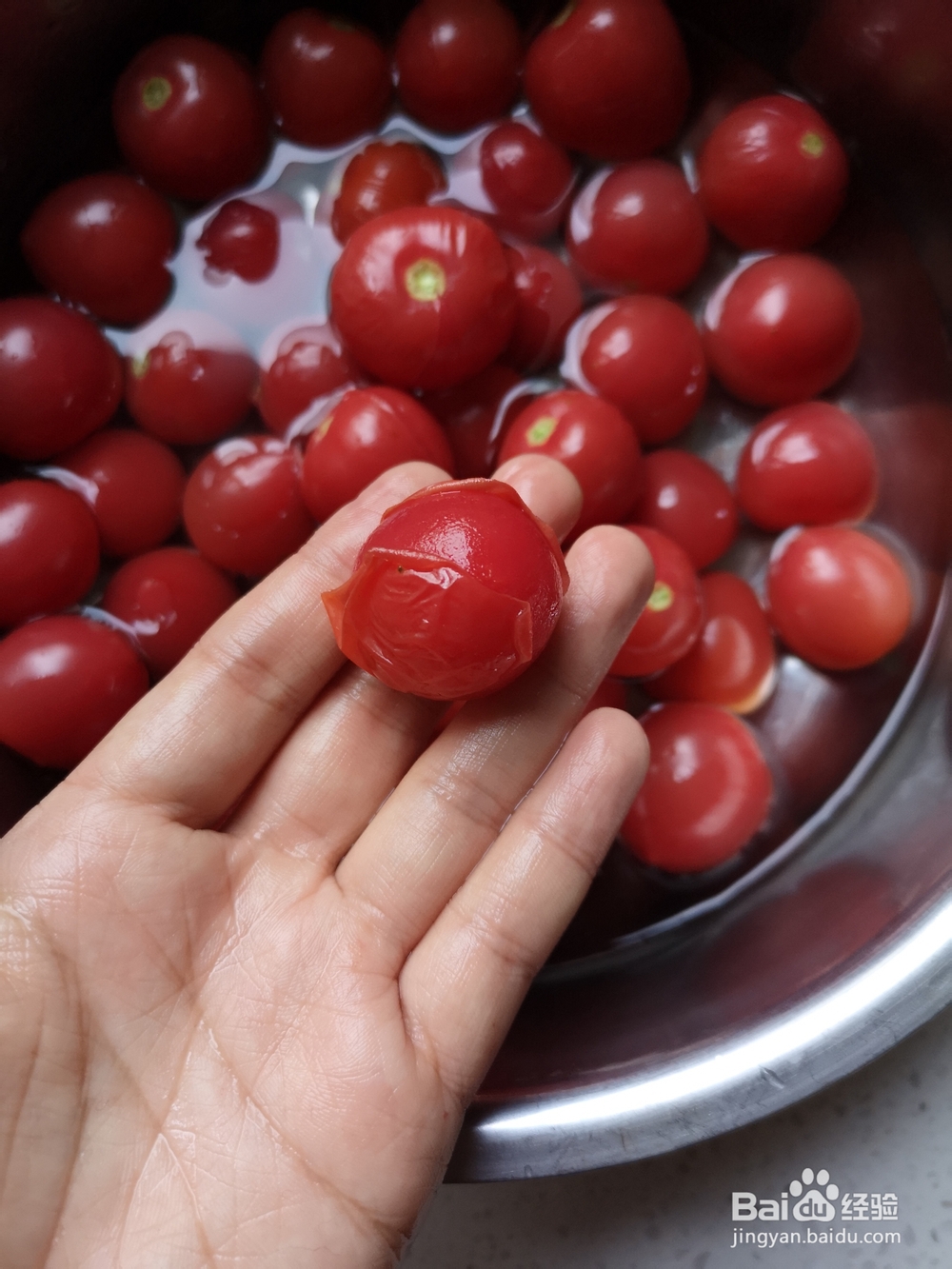 2、把小西红柿洗净,放到盆里。把水烧开。把开水倒在小西红柿上。水量不应超过小番茄的水量。10秒后,倒出沸水,倒入冷水。不要让西红柿在沸水里呆太久,过久就会变成西红柿汤。天气一凉,小西红柿就发疯了,一个接一个地剥皮。如果没有去皮的西红柿,就让它在冷水里呆一会儿,让它自己反省一下,哈?为什么不脱皮?