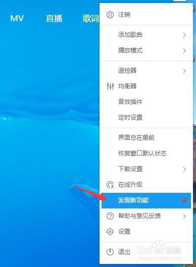 2、点击“设置”图标,可以看到下拉菜单里有“发现新功能”选项,