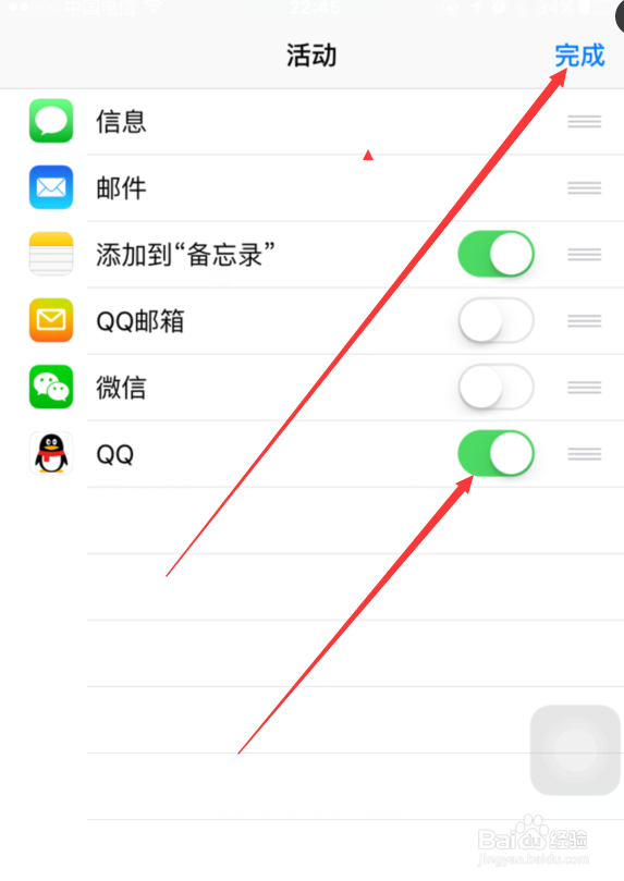 5、点击该图标后,再点击弹出对话框里的“更多”按钮,进去以后将其中的QQ软年开关按钮打开,再点击“完成”,这个时候,我们就可以用QQ分享自己需要拷贝到电脑上的录音啦,大功完成了一大半。