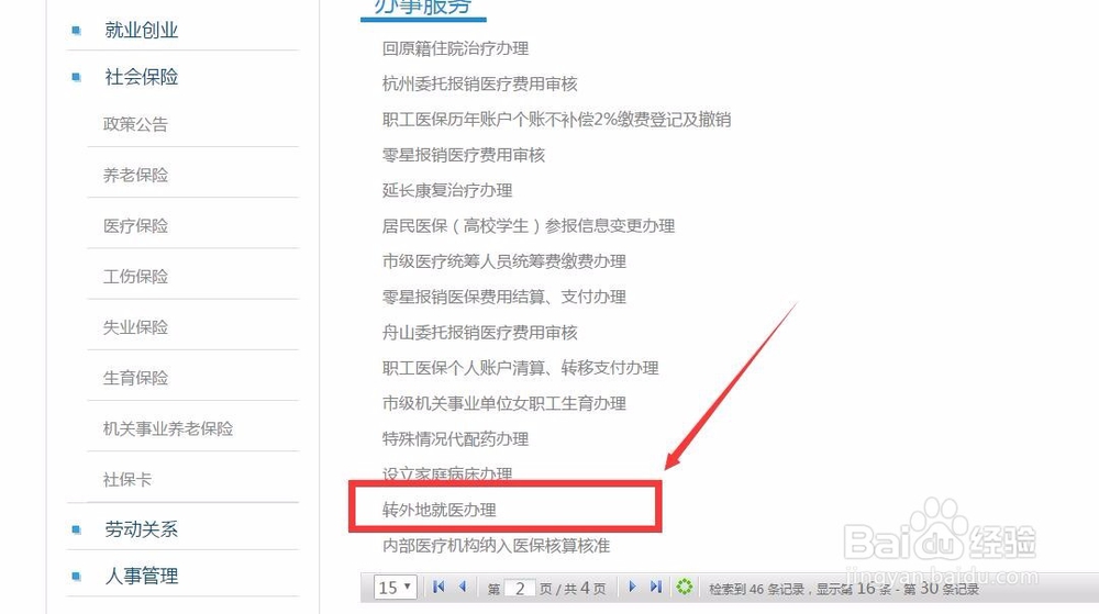4、找到转外地就医文件,可以看到办理地址和联系电话,所需文件,办理流程等信息,大家只要准备好这些材料前保备案,在外地就医时得报销比例就会有所提高。