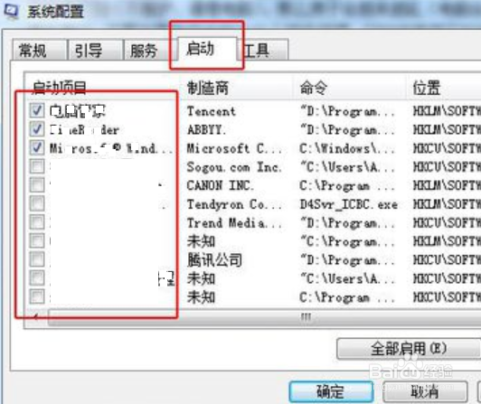 3、打开系统配置对话框选择《启动》选项卡,启动项目里打对勾的就是电脑开机需要加载的项目,把没必要启动的项目取消掉,使开机速度加快。