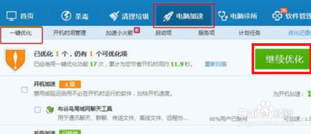 1、方法1:用电脑管家之类的软件,界面中选择“电脑加速”,再选择“立即优化”