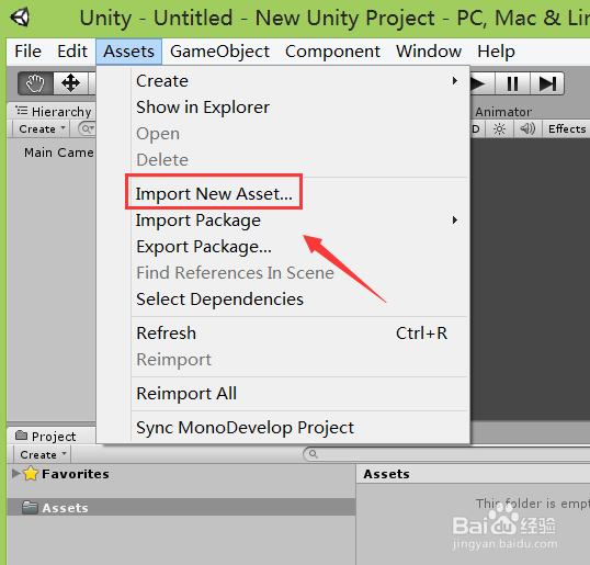 2、在该界面内找到assets菜单里的import new asset选项,如图所示;