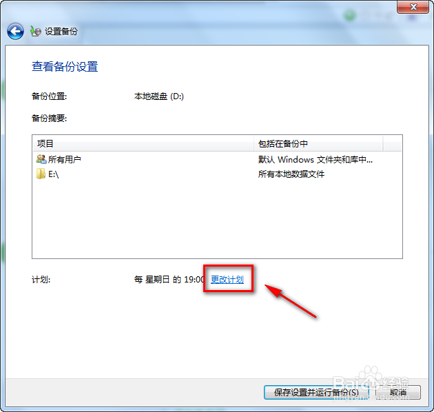 7、打开【查看备份设置】界面,其中显示备份摘要信息,单击下方的【更改计划】