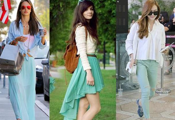 薄荷绿应该是夏天最能让人感觉清凉的色彩了,白色和薄荷绿搭配,清新时尚,还很减龄,薄荷绿和白色都是显白的颜色,所以皮肤稍微黑一点的妹子也能hold住哦。
