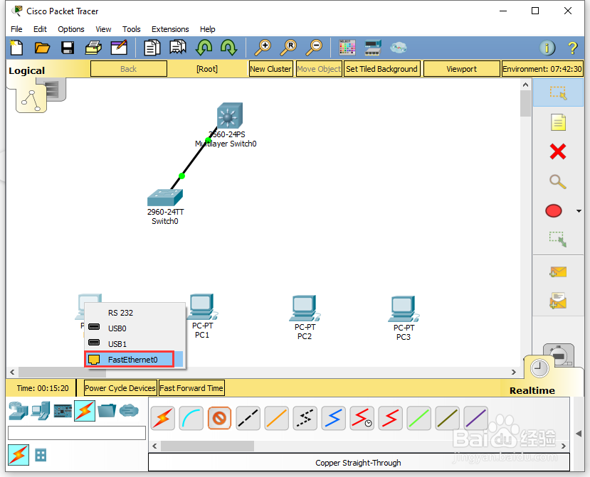 7、通过下方的设备选择区,选择【Connections】中的【Copper Straight-Through】,将工作区中的【PC3】的【FastEthernet0】与【Multilayer Switch0】的拒言【FastEthernet0/2】进行连接;