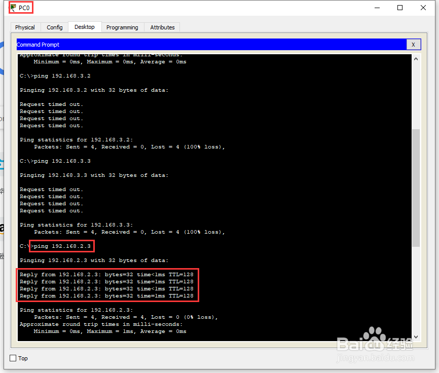输入【ping 192.168.2.3】查看PC0与PC2的网络连通性,结果为正常;